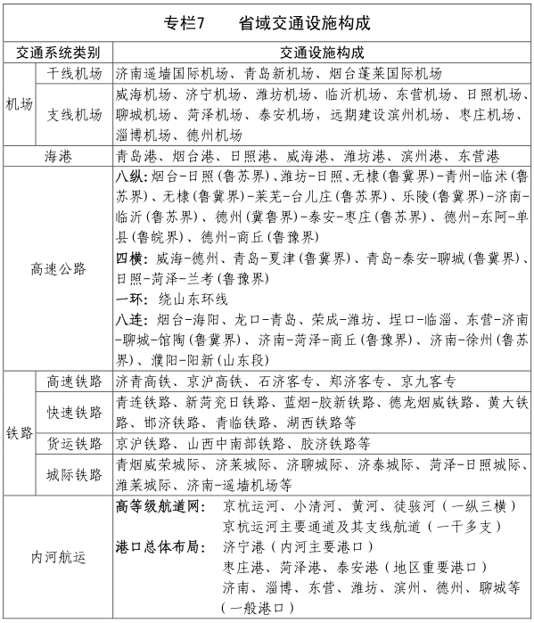 建设海陆空联动的国际物流运输体系。提升山东省对外门户地位。济南、青岛、烟台机场为干线机场,威海、济宁、潍坊、临沂、东营、泰安等13个机场为支线机场,共同构建开放的航空运输体系。强化青岛港口国际集装箱枢纽地位,联合烟台、日照等港口建设环渤海南部、黄海的物资进出口和国际贸易基地。